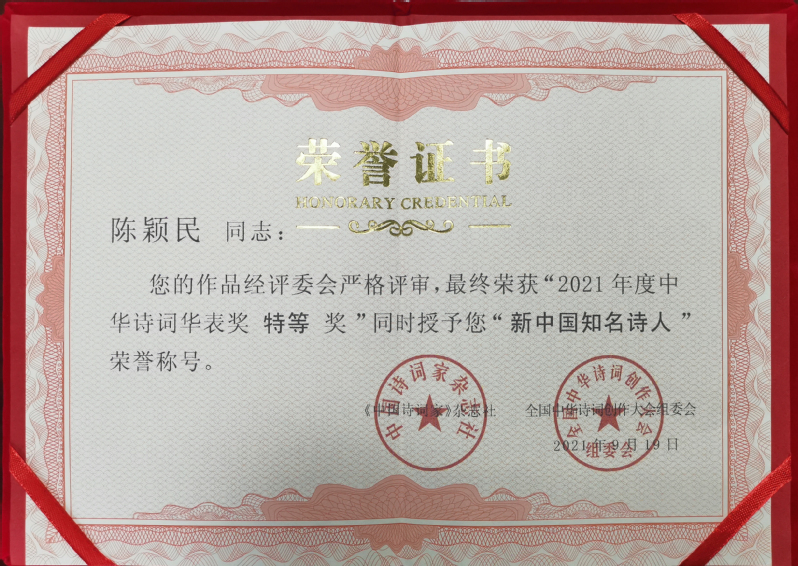 新洋農(nóng)場(chǎng)退休職工陳穎民在全國(guó)中華詩(shī)詞創(chuàng)作大會(huì)組委會(huì)舉辦的中華詩(shī)詞華表獎(jiǎng)中,獲得“特等獎(jiǎng)”并被授予“新中國(guó)知名詩(shī)人”榮譽(yù)稱(chēng)號(hào)。