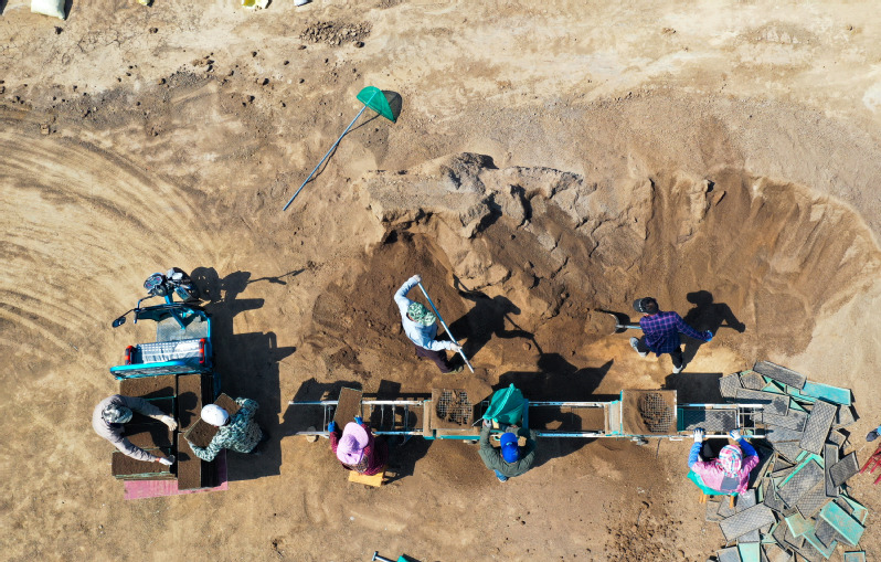 5月1日,寶應(yīng)湖農(nóng)場(chǎng)三分場(chǎng)場(chǎng)頭一派忙碌,擺盤、鏟土、倒稻種,7、8名工人分工合作,有序進(jìn)行著落谷育秧。