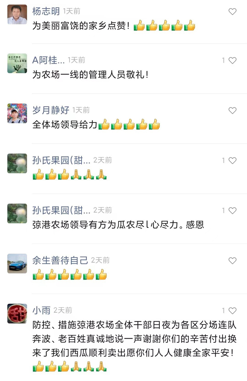 西瓜場來臨正值疫情防控形勢最嚴峻的時候,按照上級疫情防控要求,弶港農(nóng)場黨委制定出防控西瓜運銷車輛閉環(huán)管理工作方案,成立西瓜運銷“疫”線指揮部,設(shè)立八個工作專班,近百人的西瓜閉環(huán)運銷隊伍,日夜奮戰(zhàn),全程嚴密管控西瓜運銷貨車閉環(huán)管理,確保全國各地貨車開得進來,農(nóng)場職工西瓜賣得出去。在這場戰(zhàn)役中,全場廣大黨員干部在抗“疫”一線“佩黨徽、亮身份、做表率”,以“一名黨員一面旗幟”的良好形象,全力以赴,吃苦在前、沖在一線,弶港農(nóng)場2萬多噸“弶農(nóng)”牌西瓜順利銷售。“美麗弶農(nóng)”視頻號上反映西瓜運銷工作的小視頻,7千多次瀏覽量,幾百人點贊轉(zhuǎn)發(fā),閉環(huán)運銷工作得到廣大職工群眾的一致稱贊,公司黨委書記胡廣斌在工作群中感嘆道“得到群眾的好評不容易”。