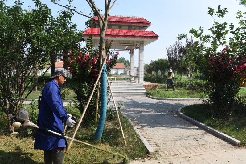 7月13日早上7時(shí),在淮海路北側(cè)的路邊微型公園里,三名環(huán)衛(wèi)職工身負(fù)割草機(jī),伴隨著隆隆的機(jī)器轟鳴聲,他們就已經(jīng)在忙著清理草坪了。據(jù)了解,最近他們的工作重點(diǎn)是修整草坪灌木綠地,維持好綠化帶的整潔美觀形象。“經(jīng)過我們的勞動(dòng),每當(dāng)看到公共綠地上的草坪被修剪得整整齊齊,就覺得一天的勞作沒有白辛苦。”環(huán)衛(wèi)工葉師傅在稍作休息之余時(shí)說。在與他們交談中了解到,他們除了修剪草坪外,還有許多諸如種花栽樹、剪枝除草、澆水抗旱、挖塘施肥、河道保潔、垃圾清運(yùn)等工作,哪里需要哪里上,他們一直以服從指揮而為整個(gè)農(nóng)場的美麗環(huán)境進(jìn)行精心地維護(hù)著。“每一項(xiàng)工作都要有人去打理,雖然環(huán)衛(wèi)工作很辛苦,但我既然選擇了這一行,就得把活干好,畢竟農(nóng)場美麗我光榮嘛!”葉師傅感言道。