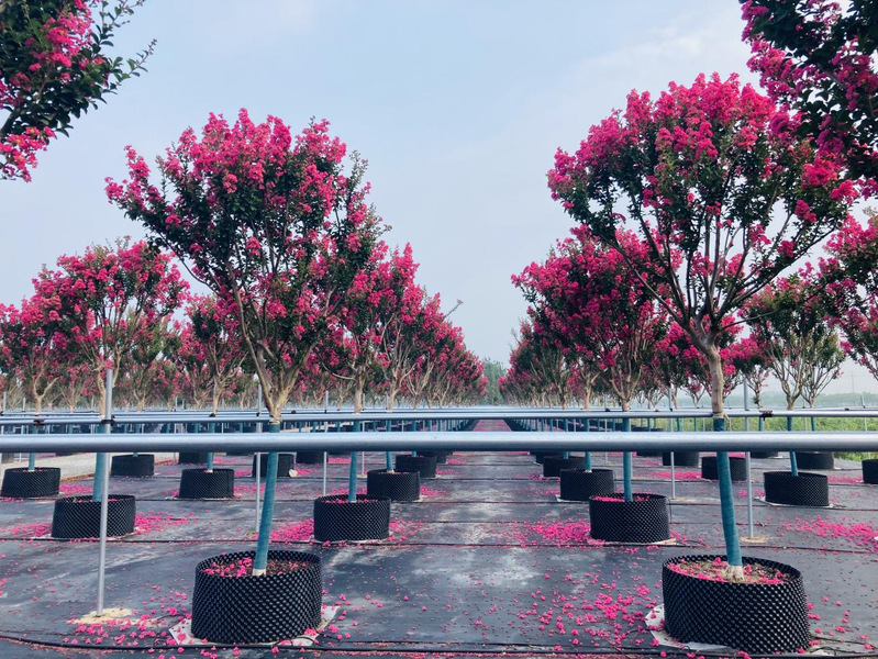 新洋林業(yè)公司容器苗三期當(dāng)下正是一幅花開似霞的盛景,紫薇花團(tuán)團(tuán)簇簇掛滿枝頭,相當(dāng)奪目。拳頭產(chǎn)品“四川紅”紫薇是農(nóng)場公司黨委和林業(yè)公司4月份頂著疫情的壓力,積極爭取引進(jìn)的產(chǎn)品,到了7月份便成為了附近居民的網(wǎng)紅打卡產(chǎn)品,獲得了居民們的一致好評和稱贊。其花期極長,從6月一直持續(xù)到10月,宋代楊萬里贊曰:“誰道花無紅百日,紫薇常放半年花。”明代薛蕙詩云:“紫薇開最久,爛漫十旬期。”因此,紫薇也有“百日紅”之稱。