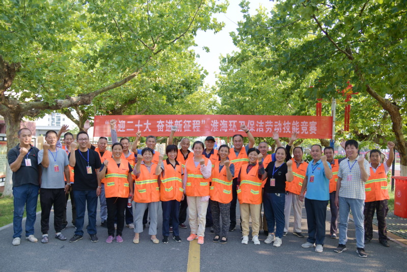 淮海農場社區綠化環衛所的環衛職工,他們用辛勤的汗水和勤勞的雙手,守護著美麗淮海的“顏值”。環衛人員也以他們兢兢業業的勞動成果,贏得了農場職工居民的廣泛贊譽和尊重。圖為結束比賽的環衛職工和裁判人員開心地在標語橫幅下合影留念。