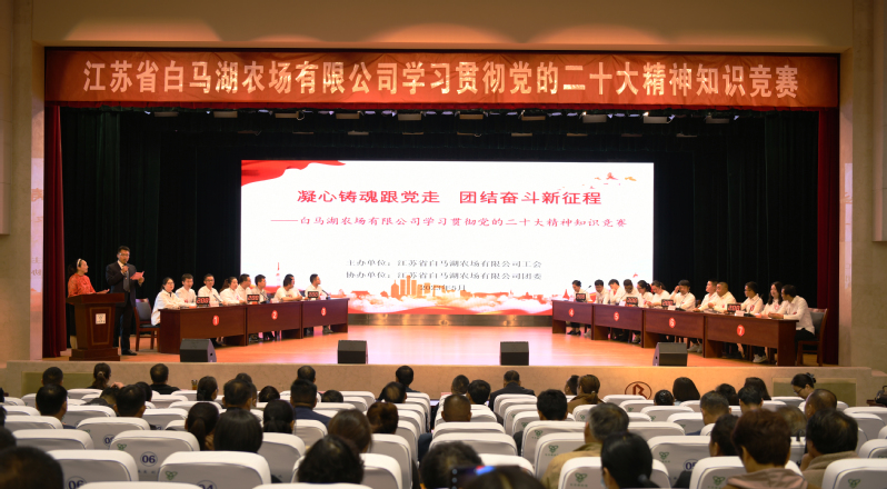 5月5日,白馬湖農(nóng)場公司“凝心鑄魂跟黨走 團(tuán)結(jié)奮斗新征程”學(xué)習(xí)貫徹黨的二十大精神知識競賽在職工禮堂火熱開賽。黨委書記、董事長韓正光,黨委副書記、總經(jīng)理韓樹明,副總經(jīng)理衡愛軍,紀(jì)委負(fù)責(zé)人時奎敬,第二片區(qū)財務(wù)總監(jiān)奚興林出席競賽。來自機(jī)關(guān)和各單位的21支代表隊共計63人參加競賽。
