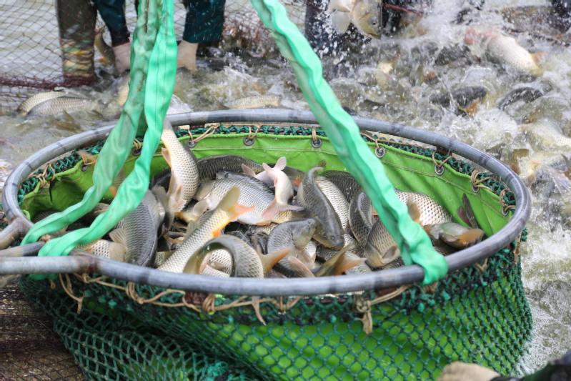 初秋的早晨已然涼意十足,早上不到6點,天剛蒙蒙亮,捕撈人員就來到魚塘開網起魚。在水產公司工作人員的指揮下,一張巨大的漁網隨著捕魚工人的移動緩緩張開,大家不顧冰冷的水下溫度,緊張忙碌了起來。經過鋪底、收網、聚攏等環節的共同協作,漁網被慢慢升起……整個現場一片繁忙熱鬧景象。經過近三個小時的忙碌,在大家的精心分揀下,裝滿魚的筐子被吊車有序吊起,稱重、記錄、放魚一氣呵成。“這個吊車頂部的黃色圓塊就是電子秤,吊起魚的同時,秤上的信號就發到這個無線接收裝置上來,秤重既方便又精準。”現場記賬的方正解釋說。