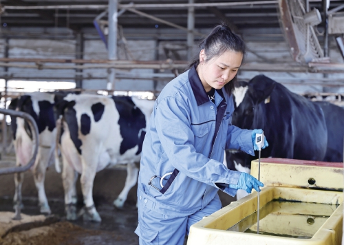 冬季低溫易引發(fā)肺炎威脅奶牛健康。春節(jié)期間,江蘇農(nóng)墾東辛農(nóng)場獸醫(yī)組技術(shù)人員實行24小時值守,密切關(guān)注牛只咳嗽、呼吸急促等疑似肺炎癥狀,及時采取隔離觀察和治療措施,全方位為奶牛健康服務(wù)。圖為技術(shù)人員檢查奶牛健康狀況。 劉興 攝