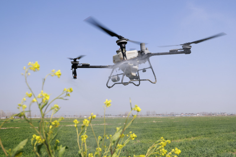 在三河農(nóng)場邱上營分場的麥田里,植保無人機進行飛防作業(yè)。 顏懷峰 錢厚紅 攝