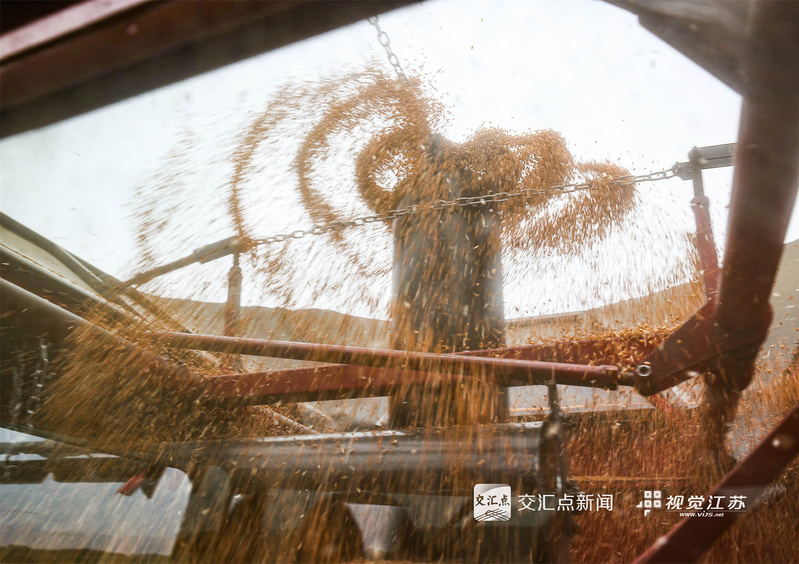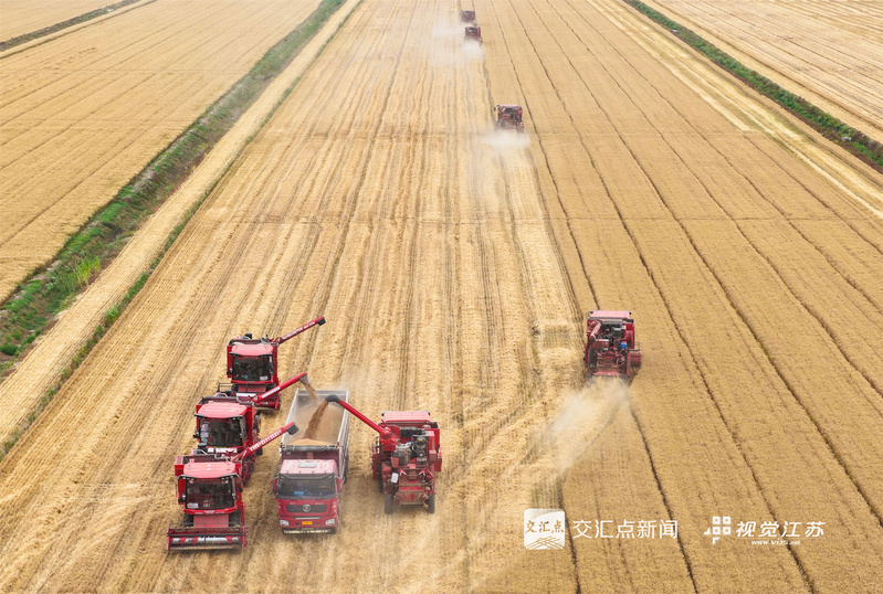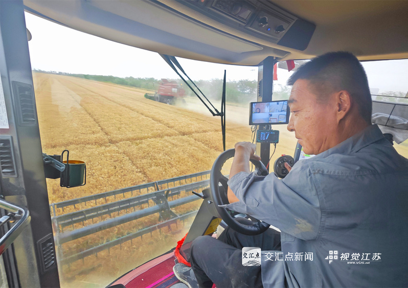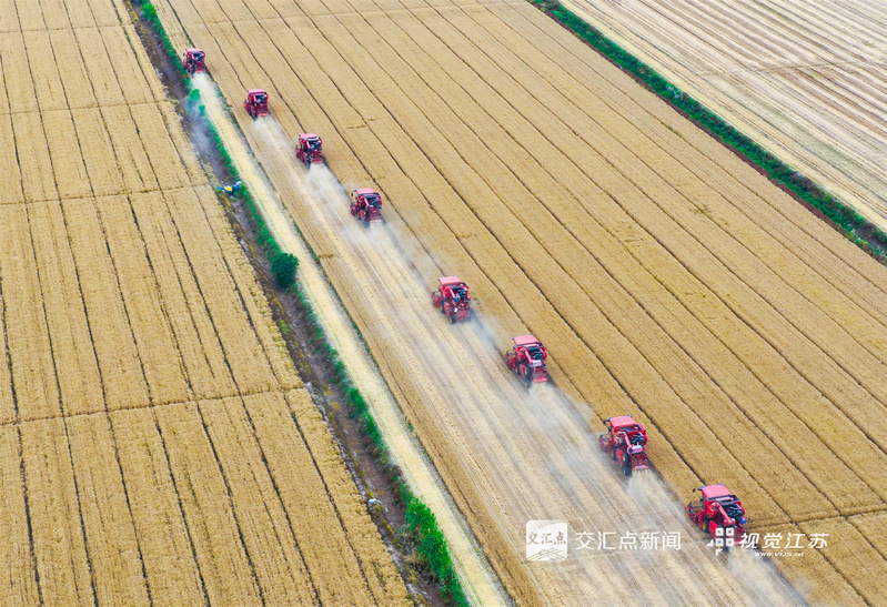 (特約攝影 許昌銀 錢(qián)厚紅 15:24攝 20:39上線)五月的麥田,金穗飄香。5月26日,淮安盱眙洪澤湖畔的江蘇農(nóng)墾三河農(nóng)場(chǎng)的3.82萬(wàn)畝小麥開(kāi)鐮收割。當(dāng)?shù)乩们绾锰鞖饧泳o收割,確保顆粒歸倉(cāng)。