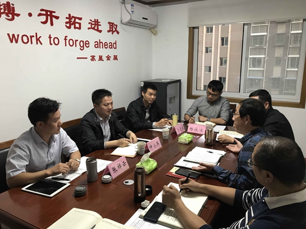 10月10日下午,集團(tuán)公司黨委委員、副總經(jīng)理仲小兵一行到蘇墾金屬調(diào)研指導(dǎo)工作,蘇墾金屬公司領(lǐng)導(dǎo)班子陪同。  仲小兵前往銷(xiāo)售網(wǎng)點(diǎn)、倉(cāng)儲(chǔ)公司實(shí)地考察了解公司的具體業(yè)務(wù)情況,并聽(tīng)取了蘇墾金屬前三季度經(jīng)營(yíng)