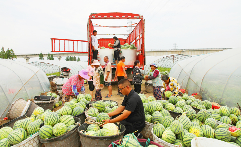 炎炎夏日,暑氣蒸騰,江心沙農場二茬西瓜迎來銷售旺季。圖為工人正忙著將剛剛采摘的西瓜裝車發往蘇南和上海等周邊城市。