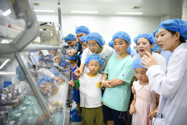 云港連夏荷,晴天正秋風(fēng)。8月20日,正大天晴第二季“愛在天晴 家倍美好”家庭活動(dòng)日在連云港廠區(qū)舉辦。開幕式上,人力資源中心總監(jiān)代表公司向在企業(yè)發(fā)展中辛勤付出的天晴人及其背后的家人表示感謝,同時(shí)宣布自2024年起,正大天晴將增設(shè)“高考陪考假”,切實(shí)將公司的“六為文化”及“家文化”傳遞給每一位勤奮拼搏的天晴人。儀式上,公司代表為即將開啟大學(xué)生活的“晴二代”們送上升學(xué)祝賀、頒發(fā)獎(jiǎng)學(xué)金。伴隨著熱烈的掌聲和飛向天際的氣球,第二季家庭日活動(dòng)在歡聲笑語中正式開啟。在研究院,小朋友們在研發(fā)人員的指導(dǎo)下,小心翼翼地將白色乳糖粉末填充到膠囊殼中。往常見到都要躲著走的膠囊,這一刻卻成了愛不釋手的小寶貝。在精心準(zhǔn)備的化學(xué)小試驗(yàn)中,生活中常見的醋、雪碧,都有自己專屬的“酸堿色”。玻璃瓶中的五顏六色激起了孩子們的好奇心和求知欲,也在他們心中播下了一顆探索的種子。在生產(chǎn)車間,小朋友們隔著護(hù)欄近距離地觀看正在作業(yè)的機(jī)械臂,伸展、抓取、轉(zhuǎn)身、放置……機(jī)械手臂行云流水般的動(dòng)作讓他們發(fā)出陣陣驚嘆。在大型生產(chǎn)設(shè)備前,孩子們?nèi)褙炞⒌芈犞v解。現(xiàn)代化藥物生產(chǎn)車間在小朋友眼里像極了鎧甲勇士的基地,置身其中,像是一腳踏進(jìn)了特?cái)z片的