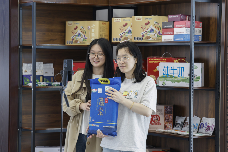 新洋農場美爾姿創新“線下體驗+線上便捷”雙渠道聯動模式,實現線上線下融合運營,既提升品牌影響力,又讓消費者品嘗到墾區優質農產品。圖為主播在直播間推薦農副產品。